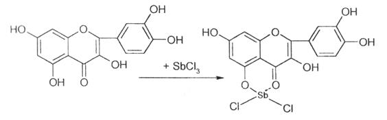 5-оксифлавоны и 5-оксифлавонолы, взаимодействуя с треххлористой сурьмой, образуют комплексные соединения, окрашенные в желтый или желто-оранжевый цвет — флавоны, в красный или красно-фиолетовый — халконы.