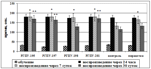 В тесте «Условная реакция пассивного избегания» у животных, получавших перед обучением РГПУ-195, РГПУ- 197, РГПУ-198, РГПУ-201, латентный период захода в темный отсек был достоверно больше, а количество заходов – меньше, чем у животных контрольной группы на всех этапах воспроизведения (через 24 часа, на 7-й, 30-й и 60-й день после обучения), что говорит о положительном влиянии на память и наличии ноотропных свойств (Рис.2.). Соединения РГПУ-195, РГПУ-197 и РГПУ-201 достоверно превосходили по выраженности ноотропного эффекта «эталонный ноотроп» пирацетам.