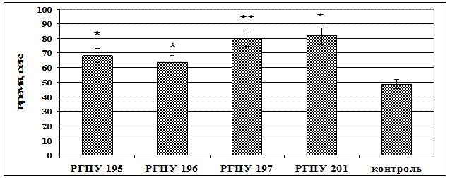 Рис.5. Влияние соединений на физическую работоспособность в «тесте принудительного плавания с грузом», вес которого составляет 20% от массы тела животного. Обозначения: * — p<0,05; ** — p<0,01– достоверность различий по сравнению с контрольной группой животных (ранговый однофакторный анализ Крускала-Уоллиса, критерий Данна для множественных сравнений).