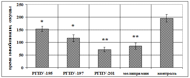 В тесте «Экстраполяционного избавления» соединения РГПУ-195, РГПУ-197, РГПУ-201 достоверно по сравнению с показателем группы контроля уменьшали латентный период двигательной активности (скорость ориентировочных реакций) и латентный период подныривания (скорость решения экстраполяционной задачи) – как на этапе обучения навыку избавления, так и на этапе его воспроизведения, что свидетельствует о положительном влиянии указанных соединений на обучаемость и память, характеризующих состояние когнитивной функции, и подтверждают наличие ноотропной активности, которая у соединений РГПУ-195, РГПУ-197, РГПУ-198, РГПУ-201 выражена в большей степени, чем у препарата сравнения пирацетама, а у РГПУ-201 – чем у фенибута и фенотропила, что подтверждает результаты теста УРПИ. Под влиянием однократного введения РГПУ-195, РГПУ-197, РГПУ-201 время иммобилизации (поведенческий коррелят депрессии) на этапе обучения достоверно уменьшалось, а количество прыжков (активных попыток избежать угрожающей ситуации) возрастало по сравнению с показателями животных группы контроля, что говорит об антидепрессантных свойствах данных соединений. В тестах «подвешивания мышей за хвост» (Рис.4.) и принудительного плавания по Порсолту эти вещества также достоверно уменьшали у животных продолжительность иммобилизации, что подтверждает наличие антидепрессантных свойств. В наибольшей степени этот эффект был выражен у соединения РГПУ-201 и РГПУ-197, при этом РГПУ-201 превосходило по активности специфический антидепрессант мелипрамин.