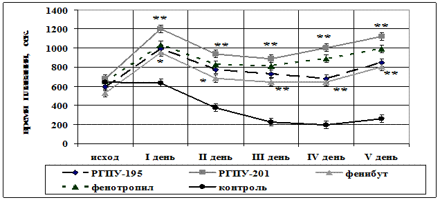 Соединения растворялись в физиологическом растворе и вводились в дозах, составляющих 1/10 от молекулярной массы (мг/кг): РГПУ-195, РГПУ-197, РГПУ-198 – 22 мг/кг; РГПУ-196 – 27 мг/кг; РГПУ-199, РГПУ-200 – 29мг/кг; РГПУ-201 – 24 мг/кг. Пирацетам, фенибут и фенотропил применялись в терапевтически эффективных дозах –400 мг/кг, 25 мг/кг, 25 мг/кг соответственно. Контрольные группы животных получали физиологический раствор в эквивалентном объеме.