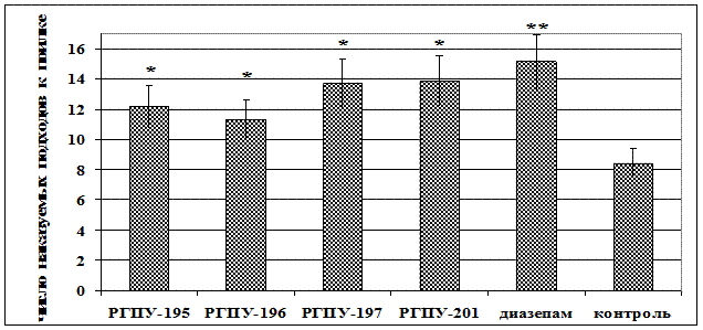 Соединения РГПУ195, РГПУ-196, РГПУ-197, РГПУ-201 в тесте конфликтной ситуации по Вогелю устраняли явления страха и тревожности перед действием наказующего болевого фактора и приводили, тем самым, к растормаживанию мотивации удовлетворения жажды, увеличивая число наказуемых взятий воды из поилки, что доказывает наличие у них специфической анксиолитической активности (Рис.6.).
