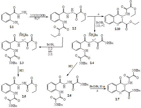 При обробці антранілогідразиду (2.1) подвійною кількістю етоксалілхлориду в присутності триетиламіну одержано етиловий естер 2-(N`-етоксалілгідразино-карбоніл)оксанілової кислоти (2.2).