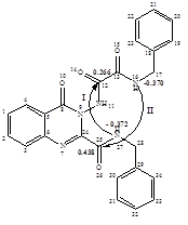 Кип’ятіння діаміду (2.6) в дифеніловому етері протягом 30 хв. приводить до утворення N-бензил-N`-(2‑бензилкарбомоїл-4-оксо-3,4-дигідрохіназолін-3-іл)оксаміду (2.7). При збільшенні тривалості нагрівання до 6 год. із реакційного середовища було виділено суміш двох продуктів, як показали хроматографічні дослідження. Для встановлення структур цих сполук, ми провели розрахунки зарядів на реакційних центрах молекули оксаміду (2.7) (АМ1, ChemOffice 2005). Згідно з якими, можна передбачити, що замикання третього циклу може відбуватися за двома напрямками.