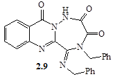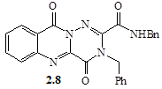 З аналізу ЯМР 1 Н-спектрів одним із продуктів реакції є N-2,3-дибензил-4,10-діоксо-4,10-дигідро-3Н -[1,2, 4]триазіно[6,1-b ]хіназолін-2-карбоксамід (2.8), на що вказує наявність триплетного сигналу NH-протону при 9,35 м.ч. та дублетного сигналу СН2 -групи бензиламідного фрагменту при 4,32 м.ч. Про утворення структури (2.9) в ЯМР-спектрі свідчать уширений синглетний сигнал NH‑протону (12,67 м.ч.), а також присутні сигнали АBCD-системи хіназолонового фрагменту в області 7,60...8,23 м.ч. та протонів бензенових ядер у вигляді складного мультиплету при 7,10...7,45 м.ч.