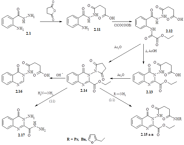 Послідовним ацилюванням антранілогідразиду (2.1) янтарним ангідридом та етоксалілхлоридом в льодяній оцтовій кислоті в присутності триетиламіну одержували естерокислоту (2.12). При нагріванні естерокислота (2.12) в оцтовій кислоті циклізувалася в похідне хіназолінону (2.13), обробка якого оцтовим ангідридом приводила до цільового іміду (2.14). Останній отримували також при дії оцтового ангідриду на сполуку (2.12); реакцію проводили без виділення проміжного продукту (2.13).