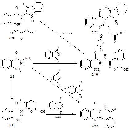 Напрямок реакції змінюється якщо фталевим ангідридом проацильована аміногрупа антранілогідразиду; так, ацилювання кислоти (2.11) фталевим ангідридом і наступним кип‘ятінням в оцтовій кислоті веде до утворення хіназолінону (2.22). Останній був також отриманий при послідовному ацилюванні гідразида (2.1) янтарним і фталевим ангідридами в оцтовій кислоті. Утворення хіназолінону (2.22) є результатом першочергового замикання хіназолінонового циклу, а наступне замикання фталазинового циклу супроводжується одночасним витисненням залишку янтарної кислоти.