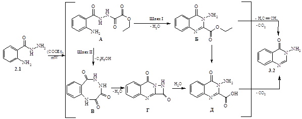 Найімовірніше, спочатку відбувається ацилування гідразида (2.1) діетилоксалатом з утворенням сполуки (А), яка за одним із шляхів (шлях І) в умовах реакції переацилується, утворюючи естер (Б). Декарбоксилування останнього приводить до кінцевого продукту реакції (3.2). За іншим ймовірним шляхом (шлях ІІ) сполука А зазнає внутрішньо-молекулярного ацилювання з утворенням інтермедіату В, який через проміжні продукти Г, Д перетворюється в хіназолінон (3.2). З метою експериментальної перевірки можливості протікання реакції по першому шляху нами була синтезована сполука Б, яку ми спробували декарбоксилювати в умовах реакції. Виявилось, що навіть при більш жорстких умовах (збільшення потужності опромінення і часу перебігу до 10 хв.) була виділена вихідна речовина, тому більш вірогідним із запропонованих можна вважати шлях II.