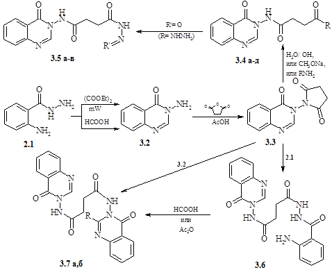 Для синтезу біспохідних 4-оксохіназоліна (3.7а, б) використовували сполуку (3.6), яку одержували нагріванням іміда (3.3) і гідразида (2.1) в середовищі діоксану або сплавленням вихідних речовин. Кращі результати спостерігалися при проведенні реакції в розчиннику. Циклізацією фрагмента антранілогідразида в молекулі сполуки (3.6) отримували відповідні біспохідні. При нагріванні сполуки (3.6) в середовищі мурашиної кислоти утворюється N,N′-ди(4-оксо-3,4-дигідрохіназолін-3-іл)сукцинамід (3.7а). Крім того, сукцинамід (3.7a) був також одержаний сплавленням іміда (3.3) з хіназоліноном (3.2). В цьому випадку реакція перебігала з більш низьким виходом, а підвищення температури або часу нагрівання призводило до руйнування речовин. Спроба провести реакцію між сполуками (3.2) і (3.3) в розчиннику успіху не мала: вихідні речовини були виділені при кип’ятінні реагентів (3.2) і (3.3) в етанолі, діоксані, оцтовій кислоті і в ДМФА. При нагріванні сполуки (3.6) з еквімолярною кількістю оцтового ангідриду в середовищі крижаної оцтової кислоти отримано біспохідне (3.7б).