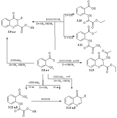 В крижаній оцтовій кислоті антраніламід (3.8г) з діетилоксалатом в залежності від часу протікання реакції дає естер (3.9в) і етиловий естер 2‑карбамоїлоксанілової кислоти (3.12а) або їх суміш, при використанні диметилоксалату в реакції утворювався метиловий естер 4-оксо-3,4-ди-гідрохіназолін-2-карбонової кислоти (3.9г).