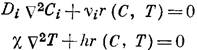 где r — скорость реакции в единице объема пористого катализатора; Di и χ — эффективные коэффициенты диффузии и теплопроводности в пористом зерне; υ i — стехиометрический коэффициент; h — теплота реакции;
