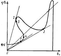 может быть неоднозначной, поэтому кривая М ( θП ) тоже может быть неоднозначной в некоторой области изменения θП. Границы области неоднозначности кривой М ( θП ), отмеченные точками 4 и 5 на рис.2, в которых |dM / d θп |=∞, соответствуют точкам максимума и минимума функции φ (θl ). Указанная неоднозначность М ( θП ) при Θ >4,5 проявляется в том случае, когда Ψ < Ψмакс, где