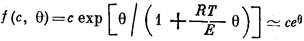 Выбор безразмерных переменных в уравнениях (26), (27) несколько необычен. За масштаб концентрации ключевого вещества внутри пористого зерна мы приняли концентрацию ключевого вещества на внешней поверхности зерна, так что с = С/С0. Аналогично, безразмерная температура внутри зерна определяется как θ = (Т — То) /Т0* ( где Т0* — масштаб внутренней температуры, зависящий от температуры внешней поверхности зерна). В соответствии с этим параметры Ψ0= l [ r (С0, Т0) / D С0 ] 1/г, Θ0=hCo D /χ T0* (параметр максимального разогрева), а также безразмерная скорость реакции f ( с, θ) = r (С, Т) / r (С0, Т 0) зависят от значений переменных на внешней поверхности зерна. Поскольку эти значения неизвестны заранее, величины Ψ0и Θ0, как и другие параметры, которые могут входить в выражение для f (с, θ), не являются характерными параметрами рассматриваемого процесса. Преимущество такого выбора безразмерных переменных заключается, однако, в том, что в дальнейшем можно воспользоваться результатами исследования хорошо изученной задачи расчета экзотермической реакции на пористом зерне катализатора при фиксированных значениях концентрации и температуры на внешней поверхности зерна. Нетрудно видеть, что Ψ0и Θ0 являются характерными параметрами этой задачи. В граничных условиях, (29) участвуют безразмерная концентрация ключевого вещества на внешней поверхности частицы c П= C0/ C∞ и безразмерная температура внешней поверхности θП =( T0- T∞ ) / T *, масштабы которых связаны уже только со значениями переменных в ядре потока.