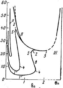 Таким образом, исследование зависимости θП (М) показывает, что при заданном значении параметра М в рассматриваемой системе возможны одно, три или пять соответствующих ему значений θП и соответственно одно, три или пять стационарных решений. Этим решениям отвечают внутрикинетический режим I, внутридиффузионный II и внешнедиффузионный III режимы и чередующиеся с ними два промежуточных неустойчивых режима. Выпишем возможные режимы процесса при Θ > 4,5 и т
