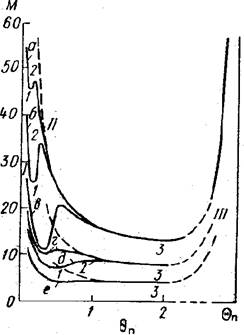 проходит через максимум, высота которого тем больше, чем больше θП или m, а при θП →Θп функция М ( θП ) спадает до нуля. При уменьшении т максимум М ( θП ) снижается, и, начиная с некоторых значений т, максимум исчезает и переход во внешнедиффузионную область при изменении параметра М происходит плавно.