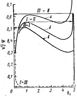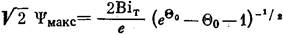 Переходы между режимами при изменении параметра Ψ (изменении внешней температуры) зависят от относительной высоты двух максимумов на кривой Ψ (θl ). Для каждого Θ > 4,5 существует такое значение параметра Biт = В iт*, что при Biт < В iт* значение функции в правом максимуме, которое линейно зависит от В iT, станет меньше значения функции в левом максимуме (см. рис.4). Оценку этого значения В iТ можно получить, считая, что вследствие слабого влияния экспоненциального фактора в формуле (50) в области левого максимума, значение Ψ в нем не зависит от В iт и равно Ψмакс. Тогда, используя (53), получаем: