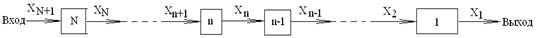 Единый подход к решению широкого класса задач на разыскание экстремума функции большого конечного числа переменных дает теория динамического программирования Беллмана. Сущность этой теории покажем на примере типичной задачи оптимизации, возникающей в химической технологии. Требуется найти оптимальный режим для последовательности N реакторов (или N -стадийного аппарата), причем на каждой стадии варьируется М независимых переменных. Пронумеруем реакторы в обратном порядке, так что первый номер присваивается последнему, а N -й — первому по ходу потока реактору. Состояние потока на выходе n -го реактора обозначим индексом n; в соответствии с этим исходное состояние потока обозначается индексом N + 1 (рис.5). Состояние реагирующего потока в общем случае описывается некоторым вектором X. Вектор X часто совпадает с вектором состава С; в более сложных случаях, однако, компонентами вектора Смогут быть, помимо концентраций ключевых веществ, также и температура потока, давление и пр. Если осуществить оптимальный выбор значений всех МN варьируемых переменных, получаем максимальное значение критерия оптимальности, — зависящее только от исходного состояния потока: