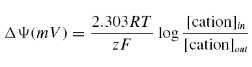 При наличии Δψ перемещение катионов через мембрану приводит к их накоплению в митохондриальном матриксе в соответствии с уравнением Нернста. При Δψ около 60 мВ концентрация катионов в матриксе увеличивается в 10 раз, а при митохондриальном Δψ в 140-180 мВ – в сотни раз (рис. 36).Мера накопления катионов в ответ на мембранный потенциал Δψ описывается уравнением Нернста, где z — это заряд на катион.