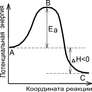 А — реагенты, В — активированный комплекс (переходное состояние), С — продукты.