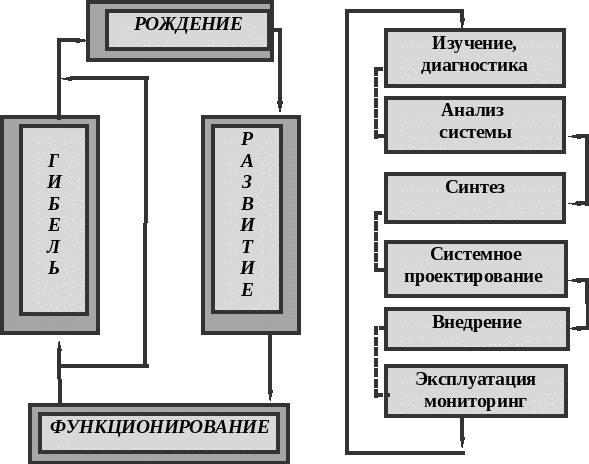 Каждая система в процессе своей жизни проходит такие этапы как: рождение, развитие, функционирование, гибель (рис. 1) или же при дальнейшем развитии проходит этап диагностики (рис.2).