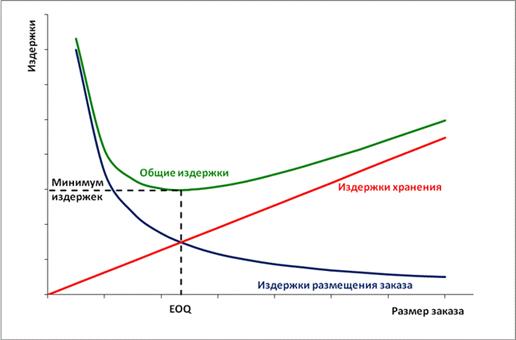 На рис. 2 показано взаимоотношение между кривыми издержек размещения заказа (обратно пропорционально размеру заказа), хранения запаса (прямо пропорционально размеру заказа), кривой общих издержек и оптимальным размером заказа.