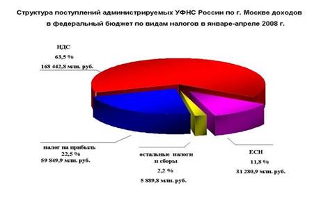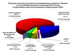 По данным сайта www.r77.nalog.ru/ структуру средств, поступивших в бюджет РФ по г.Москве в январе-апреле 2008 г. можно представить в виде следующей диаграммы: