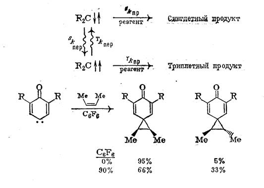 Близость синглетного и триплетного состояний и возможность их взаимных превращений представляют особый интерес в химии карбенов. Спиновое состояние карбена в момент реакции зависит не только от состояния в момент образования или от природы основного состояния, но также и от относительных скоростей процессов перехода внутри системы и реакций образования продукта. Например, многие карбены, обычно находящиеся в триплетном основном состоянии (например,: СН2 ), при регенерации в растворе образуются в синглетном состоянии и так быстро реагируют с большинством субстратов, что не успевают перейти в основное состояние.