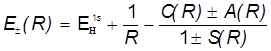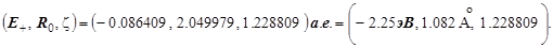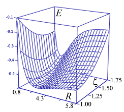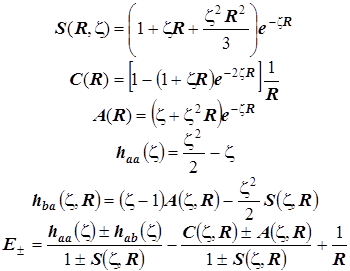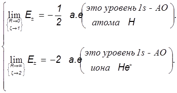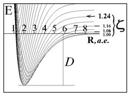 отвечают абсолютному минимуму целевой функции — полной энергии связывающей МО, определяемой в зависимости от двух переменных: межъядерного расстояния и эффективного заряда ядра — показателя экспоненты в формуле базисной АО. Энергетические уровни передаются формулой, на первый взгляд того же вида, что и в расчётах с одним варьируемым параметромR :