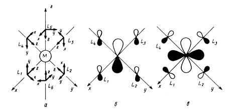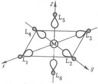 Рассмотрим вначале наиболее простой, но весьма распространенный случай комплексов, образуемых лигандами L типа (СН3 )3 Р, NH3, H2 O, ОН-, Н-, которые используют для связывания с центральным атомом металла неподеленную гибридную пару электронов или пару электронов на s-орбитали (гибрид-ион). Начнем рассмотрение с наиболее характерного типа координации — октаэдрического. Координационные связи в комплексе МL6k+, где М — переходный металл, образуются при донировании электронов с сигма- орбиталей лигандов на вакантные 3d-, 4s-, 4p- орбитали металла (возьмем атом металла третьего периода). Чтобы рассчитать валентные МО комплекса, выберем координатные оси, как показано на рис. 1, расположив вдоль них лиганды.