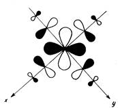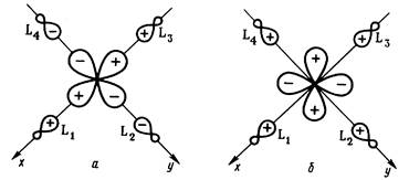 Полный базис валентных АО состоит из 15 орбиталей: девяти — металла, шести — лигандов. Только такие комбинации лигандных АО будут обобщаться в форме МО с различными орбиталями металла, которые преобразуются по одинаковым представлениям симметрии в точечной группе ОА. Нетрудно подобрать соответствующие комбинации сигма-АО лигандов (называемые групповыми орбиталями). Рис. 2, аиллюстрирует выбор групповой орбитали еg -симметрии, комбинирующейся с dx2 — y2 — орбиталью металла. Из рис. 2, бясно, почему любая комбинация сигма-АОлигандов дает нулевое перекрывание с rf-орбиталями металла типа t2 g .