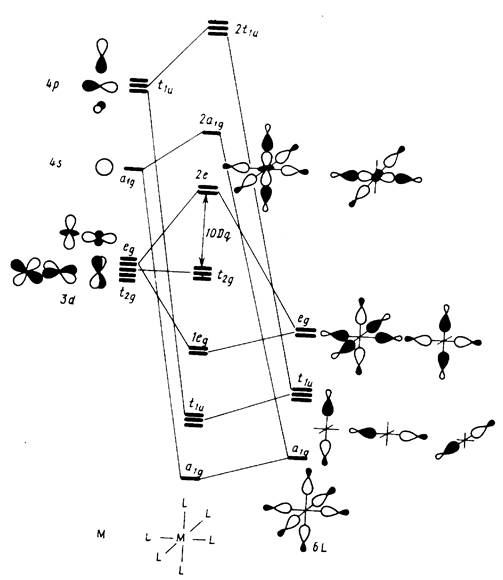 На рис. 3 дана корреляционная диаграмма МО октаэдрического комплекса. Она строится исходя из правил качественной теории МО. Имеются также многочисленные прямые расчеты электронного строения разнообразных комплексов МL6k+, выполненные в различных вариантах приближений, которые дают согласующуюся с диаграммой картину энергетических уровней.