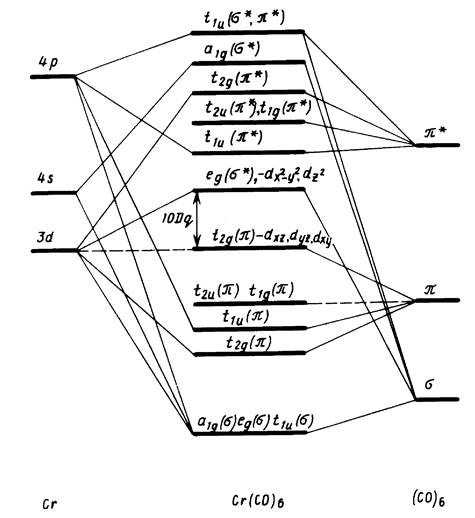 Наиболее важен эффект обобществления d-AOцентрального атома металла с вакантными пи*-орбиталями таких лигандов (С = О, С = N) в карбонильных и цианидных комплексах. На рис. 5 показана структура одной изt2 g -МО гексакарбонила хрома, образующейся при перекрывании dxy -AO металла с антисвязывающими пи*-МО оксида углерода. На рис. 6 дана корреляционная диаграмма МО гексакарбонила хрома, построенная с учетом пи- и пи*- орбиталей лиганда.