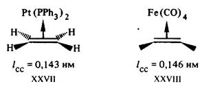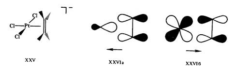 Природа связи в соли Цейзе XXV объясняется так называемой синергической моделью Дьюара—Чатта—Дункансона (1953), близкой по своей основной идее к описанию связывания в гексакар-бониле хрома (рис.7). Электронная плотность с высшей заполненной пи-МО этилена переносится на вакантную (spn )орбиталь металла (прямое донирование XXVIa). Упрочнение связи достигается также за счет эффекта обратного донирования (дативной связи) — частичного переноса электронов с заполненной d-орбитали металла на вакантную пи*-МО этилена. Строгие расчеты хорошо согласуются с общей схемой XXVI формирования связи в пи-комплексе XXV и других подобных ему структурах. Отвлечение электронной плотности со связывающей и частичное заселение антисвязывающей орбиталей этиленового фрагмента в XXV должно приводить к разрыхлению связи С = С в комплексе. Действительно, если частота валентного колебания этой связи в молекуле этилена равна 1623 см-1, а длина связи 0,1337 нм, то в соли Цейзе частота колебания связи понижается до 1511 см-1, а длина связи возрастает до 0,1354 нм.