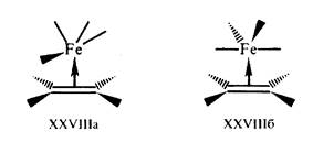 Еще более значительные изменения происходят в этиленовых тг-комплексах (рис.8.). Учитывая типы взаимодействий XXVIa, б, определяющих связывание в пи-комплексах, можно подойти к решению вопроса о конформационной предпочтительности пи-комплексов. Например, для железокарбонильного комплекса XXVIII можно представить две альтернативные конформации, учитывая бисфеноидную геометрию фрагмента Fe (CO)4 и предпочтительность экваториального положения алкена (рис. 9.):