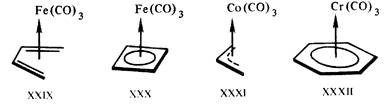 Аналогичная схема связывания осуществляется и в пи-комплексах, образуемых более сложными сопряженными алкенами, таких, как, например, металлкарбонильные комплексы XXIX—XXXII (рис. 10.).