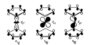 Восемнадцать валентных электронов ферроцена (восемь от центрального атома d6 s2) заполняют все нижние уровни вплоть до е2 g. Связи между металлом и кольцами обусловливаются МО а1 g и е1 g. Вид некоторых МО ферроцена показан на рис. 14.
