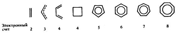с р— d-донорным эффектом (Сl-, ОН- ), и сигма-лиганды с d-пи* -акцепторными свойствами (СО, CNR, CR2, NO+ ). Кроме того, пи-лиганды рассматриваются аналогичным образом как льюисовские основания, причем число вносимых ими электронов приравнивается к числу электронов на связывающих и несвязывающих пи-МО. Это число можно оценить согласно рис.15.