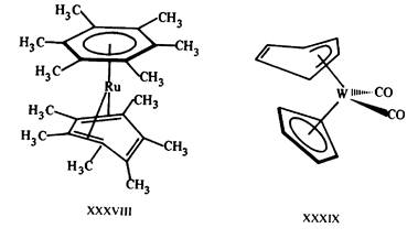 Нетрудно проверить выполнение правила 18 электронов для большинства рассмотренных выше пи-комплексов, например ферроцена (M = Fe), хромоцена (М = Сг). В отличие от последнего в валентной оболочке рутеноцена в структуре D6h -симметрик (M = Ru) содержалось бы не 18, а 20 электронов (Ru — d6s2, 8 электронов и по 6 электронов от каждого бензольного кольца). Чтобы иметь в валентной оболочке 18 электронов, структура рутеноцена должна быть искажена таким образом, чтобы одно из бензольных колец участвовало в связывании лишь двумя пи-связями. Именно такая структура XXXVIII найдена для перметильного производного рутеноцена (рис. 16). В отличие от неполярного симметричного хромоцена IX молекула XXXVIII характеризуется достаточно высоким дипольным моментом 2,03 D в растворе. Другой аналогичный пример — искажение пятичленного циклопентадиенового кольца в сэндвичевом вольфрамдикар-бонильном комплексе XXXIX (рис. 16), позволяющее вывести одну пи-связь (два электрона) из общего связывания. Атом вольфрама вносит шесть, два карбонильных лиганда — четыре, плоский циклопен-тадиенильный фрагмент — пять, а деформированный — три электрона.