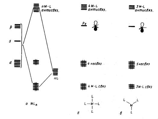 Это правило можно трактовать как стремление центрального атома металла иметь замкнутую электронную оболочку соответствующего атома инертного газа. Можно представить и другое общее объяснение, позволяющее одновременно предсказать важные исключения из данного правила. На рис. 18, априведена обобщенная диаграмма орбитальных взаимодействий валентных р-, s-, d-орбиталей (общее число которых равно 9) с n симметризованными сигма-орбиталями лигандов L в комплексе MLn. Подходящие по симметрии n-орбитали центрального атома (можно рассматривать их как соответствующие dx sy pz -гибридные орбитали) образуют с орбиталями лиганда nсвязывающих и n антисвязывающих МО, а (9 — n) d-орбиталей металла, имеющих отличную симметрию, образуют несвязывающий уровень. Очевидно, что на связывающих и несвязывающих уровнях можно разместить 18 электронов.