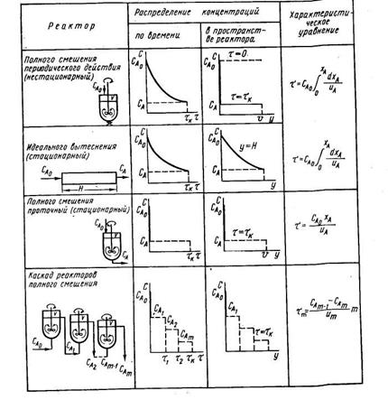 Реакторы периодического и непрерывного действия. Реакторы периодического действия работают при нестационарном технологическом режиме. При этом независимо от степени перемешивания реагирующих масс изменяются во времени не только концентрации реагентов, но и температура, давление, а соответственно и константа скорости процесса. Если периодический реактор работает в режиме полного смешения, то время, необходимое для достижения заданной степени превращения, рассчитывается по характеристическому уравнению (см. табл.), которое совпадает с характеристическим уравнением реактора идеального вытеснения (см. табл.). Следовательно, если были бы возможны одинаковые условия проведения процесса в реакторах периодического действия и идеального вытеснения, то их объемы были бы равны между собой. Однако, условия протекания процессов в промышленных проточных реакторах, как правило, лучше, чем в периодических.