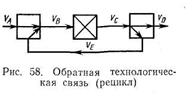 Обратная технологическая связь (рис. 1, г) характеризуется наличием рециркуляционного потока, связывающего выход последующего элемента ХТС с входом предыдущего.