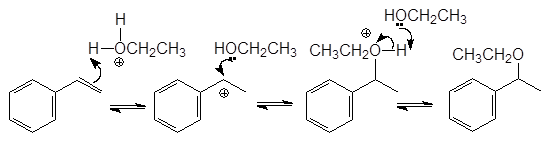 В присутствии кислоты спирты присоединяются к алкенами с образованием эфиров. Механизм реакции напоминает механизм гидратации алкенов.