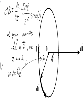 Из (7) следует, что векторdB перпендикулярен плоскости чертежа и направлен На нас. Так как все векторы dВ, создаваемые отдельнымиdL ,