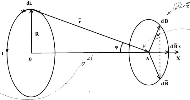 тока dL и точку А, а следовательно, они образуют симметричный конический веер. Геометрическая сумма всех векторов dB числено равна алгебраической сумме проекций всех векторов на ось X. Проекция вектора d В х на ось Х равна