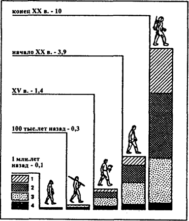 Расход энергии на одного человека (в ккал/сут.) в каменном веке был около 4 тыс., в аграрном обществе —12 тыс., в индустриальную эпоху — 70 тыс., а в передовых развитых странах конца XX в. — 230— 250 тыс., т. е. в 58—62 раза больше, чем у наших далеких предков.