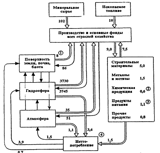 Примечание: двойные стрелки — потоки потребления; одинарные стрелки — потоки отходов и загрязнения среды. Условные обозначения (в кружках): 1 — потребление биомассы; 2 — в химическую продукцию входят минеральные удобрения (0,18 Гт /год) и органическая синтетика (0,12 Гт /год); 3 — указаны брутто-продукты; нетто-потребление продуктов питания составляет 0,9 Гт /год; 4 — имеются в виду все товары (продукты, вещества, материалы, изделия) индивидуального пользования
