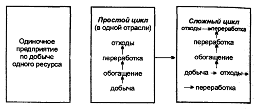 1. Цикл почвенно-климатических ресурсов и сельскохозяйственного сырья 2. Цикл лесных ресурсов и лесоматериалов 3. Цикл ресурсов фауны и флоры | 1. Цикл энергоресурсов и энергии с гидроэнергетическим и энергохимическим подциклами 2. Цикл металлорудных ресурсов и металлов с коксохимическим подциклом 3. Цикл неметаллического ископаемого сырья с подциклами горно-химических и минеральных строительных материалов |