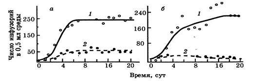 Рисунок 2 — Динамика популяций инфузорий Paramecium aurelia(1) и Paramecium caudatum (2), культивируемых при регулярном добавлении в среду одного и того же количества пищи: а-изолированные популяции каждого вида; б- совместно культивируемые популяции (по Гаузе,19)