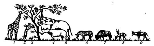 Рисунок 3 — Распределение копытных зверей по ярусам питания в африканской саванне: 1-жираф;2-антилопа геренук;3-антилопа дик-дик; 4-носорог;5-слон;6-зебра;7-гну;8-газель Гранта; 9-антилопа бубал(по де ла Фуэнте,1972)