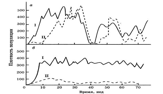 На рис. 4 приводится пример эволюции гомеостаза двух насекомых в системе «хозяин-паразит», которые помещались в клетку, состоящую из 30 пластиковых камер, соединенных друг с другом трубочками, замедлявшими расселение паразита. На Рис. 4 а видны резкие подъемы и спады плотности популяций, так как в этом случае дикие особи недавно посажены вместе. На рис. 4 б популяции взяты из колоний, в которых они просуществовали совместно в течение двух лет и здесь уже отмечается более стабильное равновесие, резкие спады отсутствуют, так как у хозяина появляется адаптивная устойчивость, о чем свидетельствует сильное снижение рождаемости у паразита.